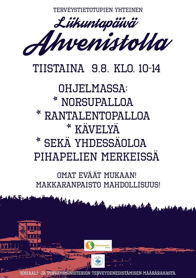 Hämeen Setlementti järjestää kaikille avoimen ja maksuttoman liikuntapäivän Ahveniston ranalla tiistaina 9.8.2016 klo 10-14.
